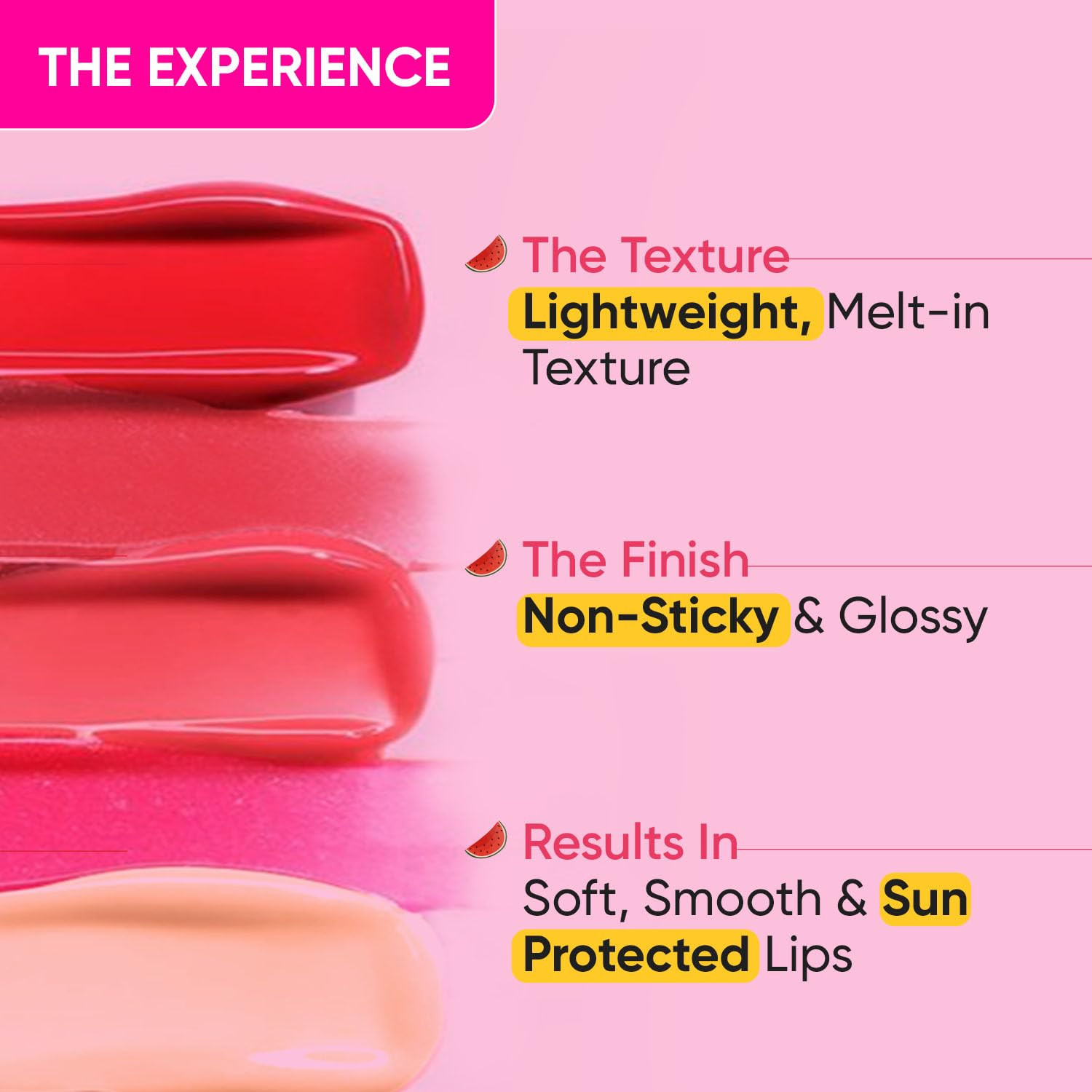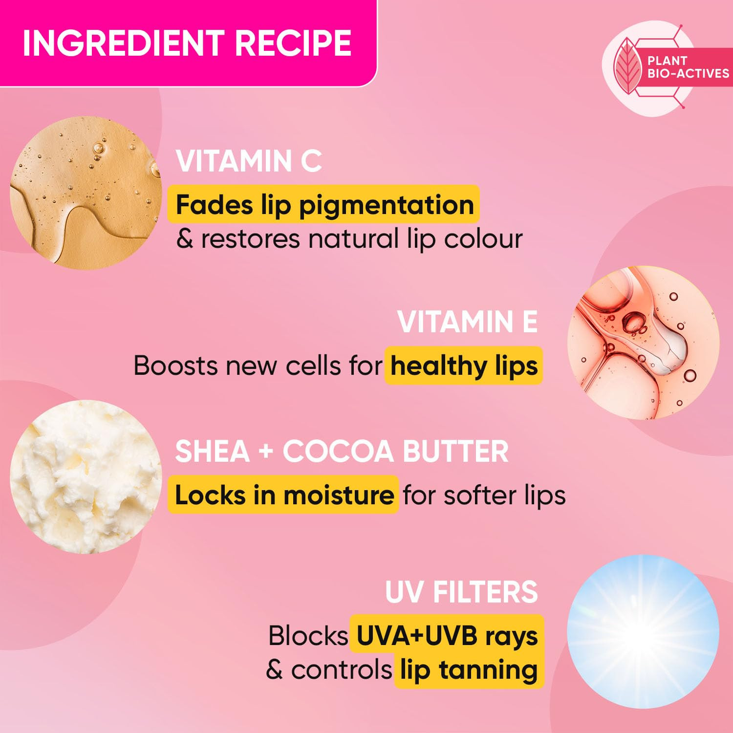 🔹 UV Filters (SPF 50): SPF 50 সানস্ক্রিন ফিল্টার ঠোঁটকে সূর্যের UVA ও UVB রশ্মি থেকে সুরক্ষা প্রদান করে, যা ঠোঁটের ত্বক পুড়ে যাওয়ার ঝুঁকি কমায়।