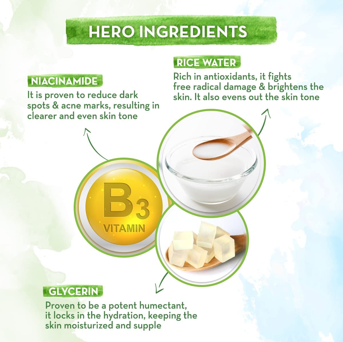⏩ নায়াসিনামাইড: ত্বকের রং সমান করে এবং লোমকূপ, দাগ এবং ব্রণের চিহ্ন কমায়।
