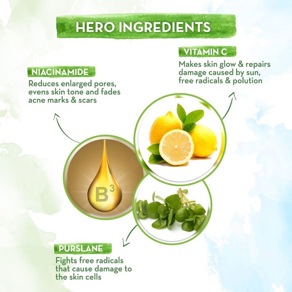 ⏩ ভিটামিন C: একটি শক্তিশালী অ্যান্টিঅক্সিডেন্ট যা সূর্যের ক্ষতি, ফ্রি র্যাডিক্যাল এবং দূষণের কারণে হওয়া অক্সিডেটিভ ক্ষতি নিরপেক্ষ করে। এটি ত্বকের প্রাকৃতিক পুনর্জন্ম প্রক্রিয়া ত্বরান্বিত করে এবং ত্বককে স্বাস্থ্যকর উজ্জ্বলতা দেয়।