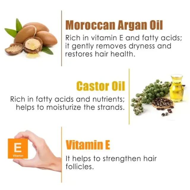 ⏩ মরক্কোর আর্গান তেল: ভিটামিন ই এবং ফ্যাটি অ্যাসিড সমৃদ্ধ যা দুর্বল চুলকে মজবুত করে এবং মাথার ত্বক ও চুলে আর্দ্রতা ধরে রাখতে সহায়তা করে।